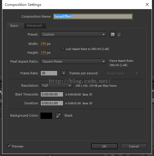 设置参数。命名hoverEffect,分辨率与网页中加动画效果相应div的宽高相同。本例中是240*143 。帧率设置为30,时间1秒就足够了。