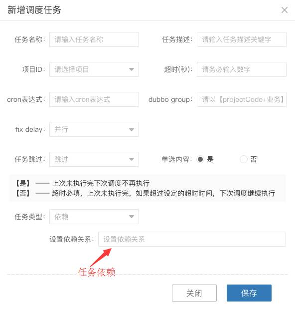 任务依赖,支持配置任务依赖关系,当父任务在执行完成之后会自动触发子任务的执行例如:有两个任务,分别为A和B,而B的执行条件为确认A任务执行完,B才能执行,否则,B任务不执行,此时的依赖关系就是B任务依赖A任务,此时在A任务配置完之后,设置B任务为依赖任务,而依赖关系则是A;又例如有6个任务,分别是A1,A2,A3,A4,A5,B,而B任务的执行需要确保A1-5这5个任务都执行完,B任务才执行,此时,B的依赖关系就是B任务依赖于A1-5,此时在配置完A1-5这5个任务之后再设置B为依赖任务,依赖关系则是A1-5