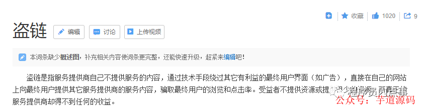 盗链是个什么操作,看一下百度给出的解释:盗链是指服务提供商自己不提供服务的内容,通过技术手段绕过其它有利益的最终用户界面(如广告),直接在自己的网站上向最终用户提供其它服务提供商的服务内容,骗取最终用户的浏览和点击率。受益者不提供资源或提供很少的资源,而真正的服务提供商却得不到任何的收益。