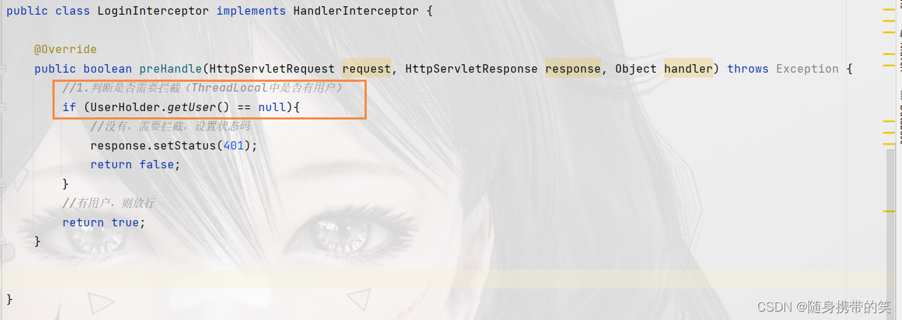 至此虽然我们获取到了对象信息,但是不只一个业务需要获取登录用户的信息,比如发布博客,发表评论,都需要获取用户名称等信息。我们也不可能每个业务都去添加这段代码,要想再方法执行前统一做一些操作,就用到了我们的拦截器,也可以拦截未登录用户。