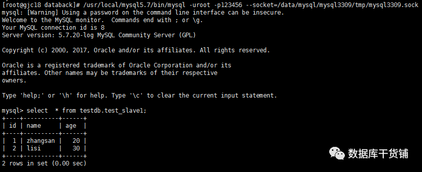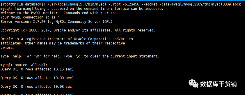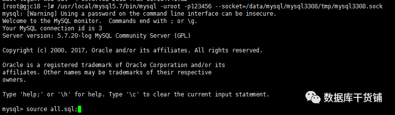 [root@gjc18 ~]# /usr/local/mysql5.7/bin/mysql -uroot -p123456 --socket=/data/mysql/mysql3308/tmp/mysql3308.sock