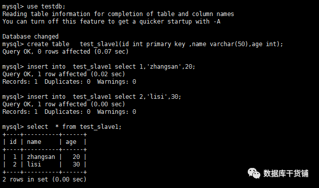 mysql> create table test_slave1(id int primary key ,name varchar(50),age int);