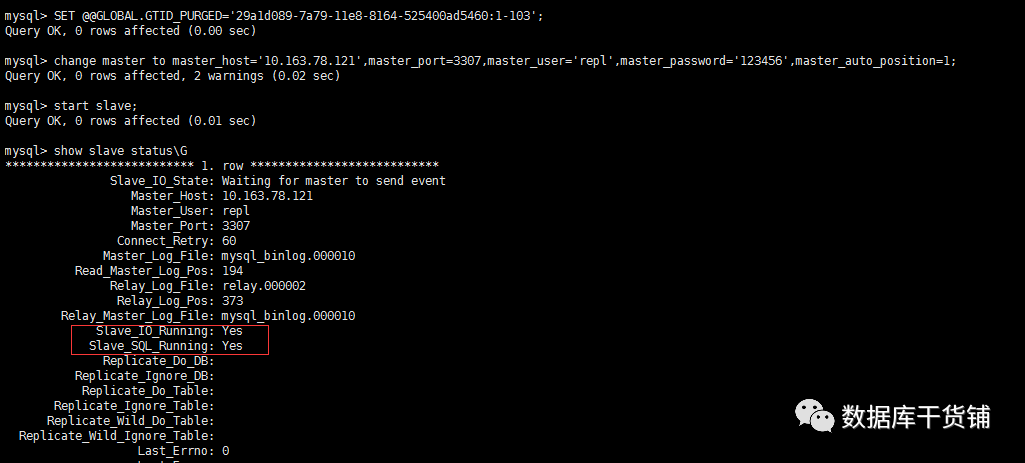mysql> SET @@GLOBAL.GTID_PURGED='29a1d089-7a79-11e8-8164-525400ad5460:1-103';Query OK, 0 rows affected (0.00 sec)