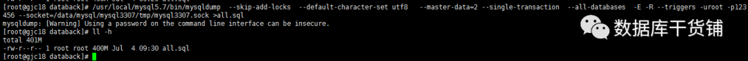 /usr/local/mysql5.7/bin/mysqldump --skip-add-locks --default-character-set utf8 --master-data=2 --single-transaction --all-databases -E -R --triggers -uroot -p123456 --socket=/data/mysql/mysql3307/tmp/mysql3307.sock >all.sql