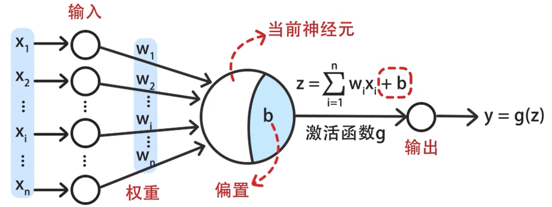 神经网络,这是机器学习的元老,是对人脑神经元工作机制的模拟,每个神经元是一个计算单元,输入的数据与权重进行相乘、求和,再加上偏置,得到的数据再经过激活函数,将结果进行输出,见下图,多个神经元相互连接组成神经网络,具体就不展开说了。