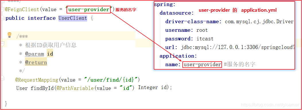 注意: FeignClient注解参数value的值对应的是我们提供者application.yml文件中给的服务的名字,RequestMapping参数路径要与提供者对该方法的实现的路径保持一致