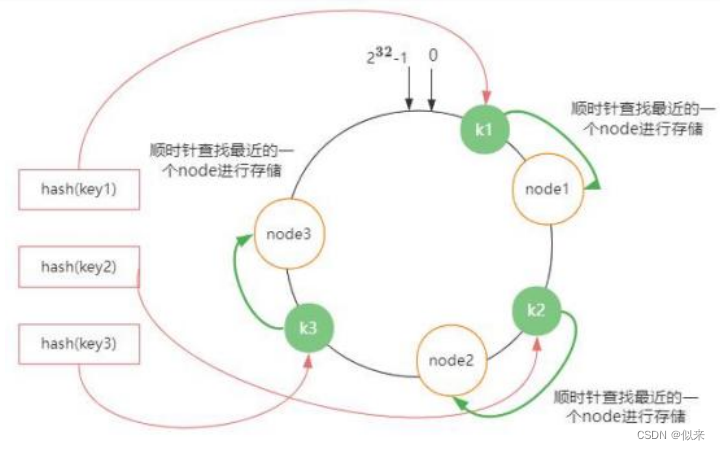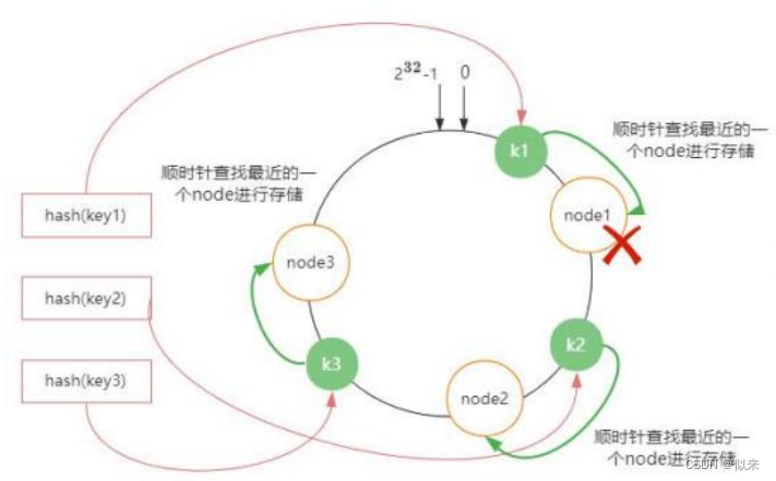 然后这个目标key会按照顺时针的方向找到离自己最近的一个节点进行数据存储。