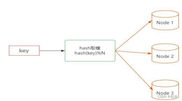 一般情况下,我们会使用hash表的方式以key-value的方式来存储数据,但是当数据量比较大的时候,我们就会把数据存储到多个节点上,(如图)然后通过hash取模的方法来决定当前key存储到哪个节点上。