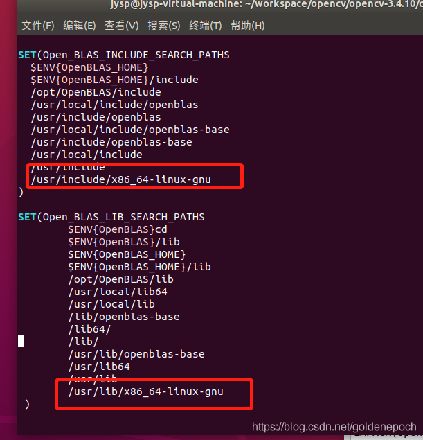 如果确定按照教程已安装了openblas相关的库仍旧找不到,请编辑opencv-3.4.10/cmake/OpenCVFindOpenBLAS.cmake下的文件