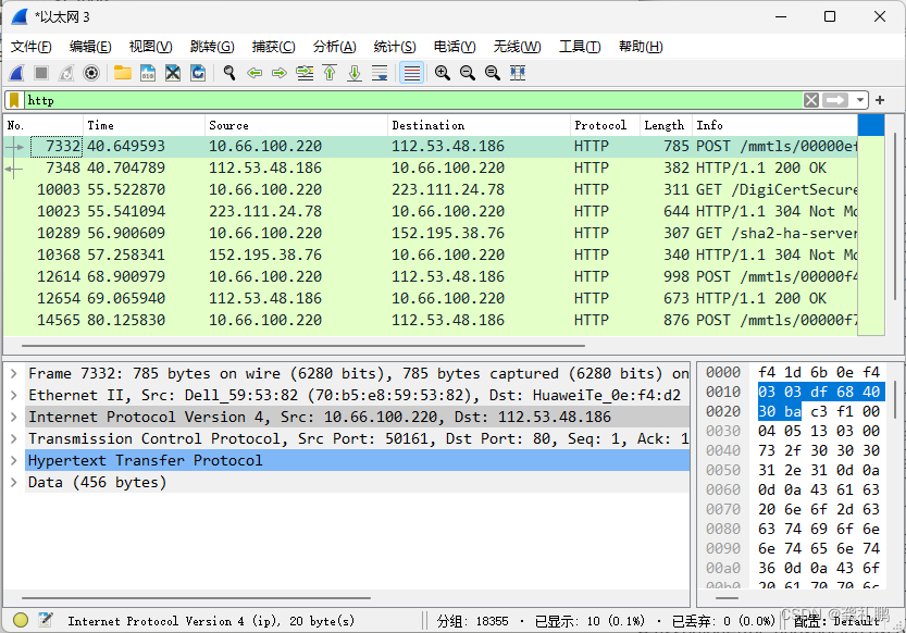 由此可见,Wireshark 对 HTTP 协议数据包进行解析,显示了 HTTP 协议的层次结构。