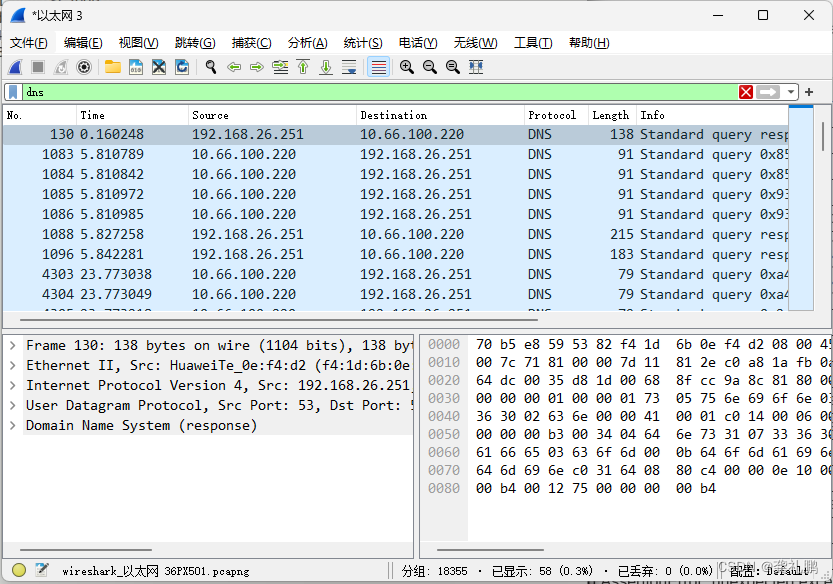 例如,要从捕获到的所有数据包中,过滤出 DNS 协议的数据包,这里使用 dns 显示过滤器,过滤结果如图所示。图中显示的所有数据包的协议都是 DNS 协议。