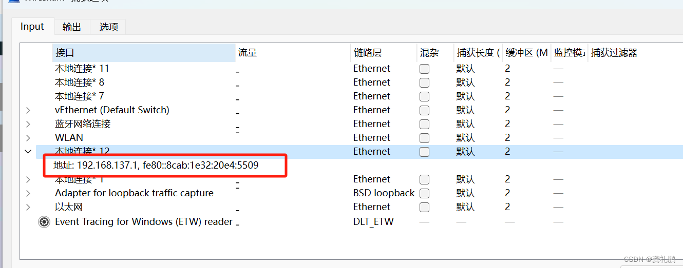 2. 在上图中,选择捕获“本地连接”接口上的数据包。选择“本地连接”选项,然后单击左上角的“开始捕获分组”按钮,将进行捕获网络数据,如下如所示。