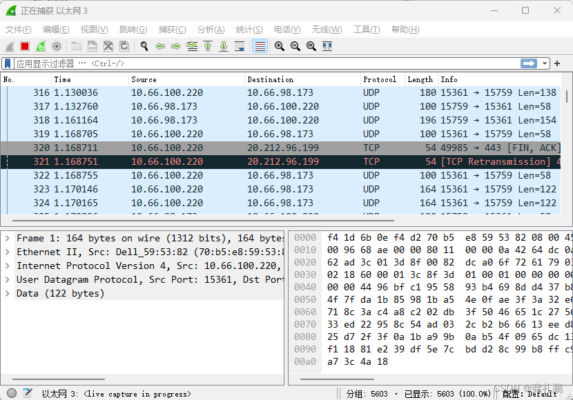 1. 使用 Wireshark 捕获数据包,界面如图所示。