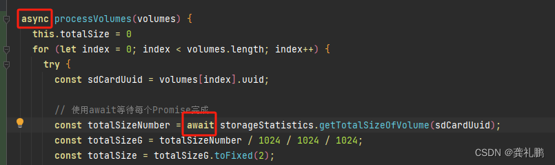具体方式是在调用返回值为Promise的方法前面加上await,并将这些异步转成同步的代码块封装成一个方法,在前面加上async关键字,如下: