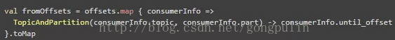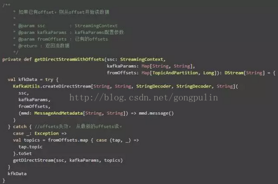方法createDirectStream中,ssc是StreamingContext;kafkaParams的具体配置见Receiver-based之中的配置,与之一样;这里面需要指出的是fromOffsets ,其用来指定从什么offset处开始读取数据。