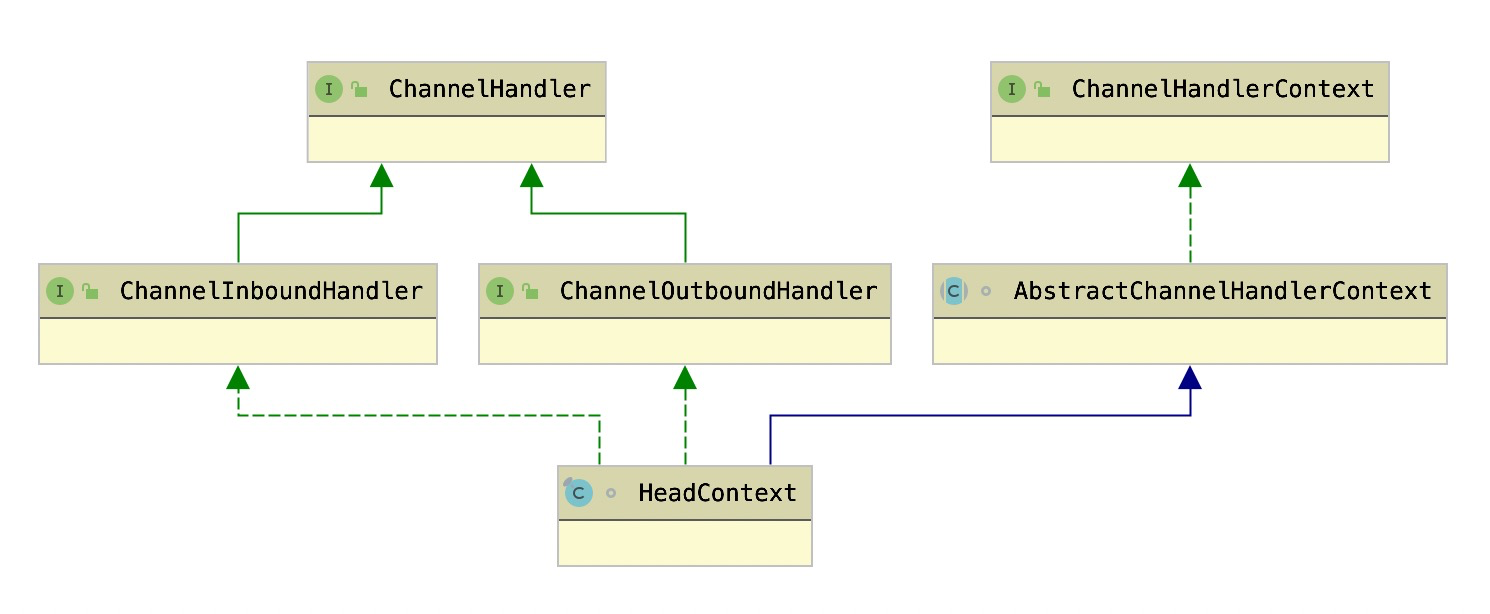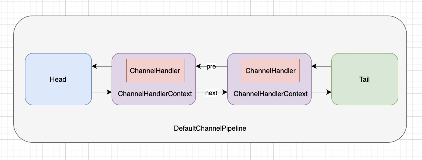 有两个比较特殊的节点: Head 和 Tail,它们分别是链表的头节点和尾结点,每个 pipeline 中至少存在这两个节点。它们内部并没有 handler,而是直接完成相应的功能。
