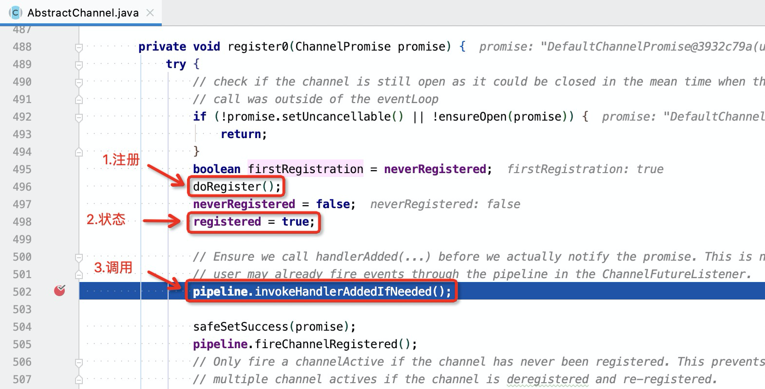 以 channel.register 操作为例,它用于完成注册操作。如下是 AbstractChannel 的 register0 方法的部分代码