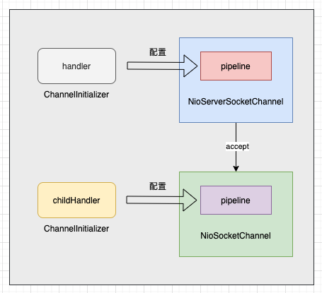 如下图所示,假如一个 netty server 的 channel 配置为 NioServerSocketChannel,当接收到客户端的一个连接请求时,它会创建一个 NioSocketChannel 从而与客户端建立连接并处理后续请求。NioServerSocketChannel 和 NioSocketChannel 上分别会绑定自己的 pipeline,用于对入站、出站事件进行定制处理。