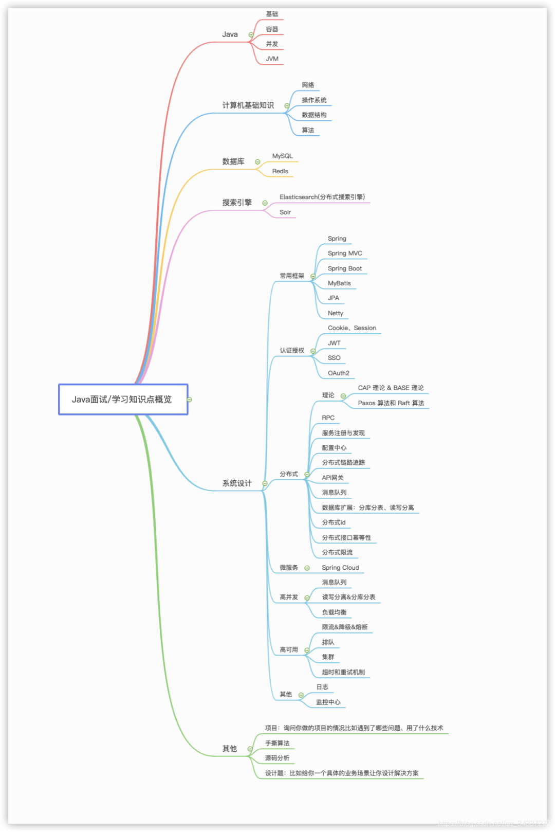上面思维导图大概涵盖了技术面试可能会设计的技术,但是你不需要把上面的每一个知识点都搞得很熟悉,要分清主次,对于自己不熟悉的技术不要写在简历上,对于自己简单了解的技术不要说自己熟练掌握!