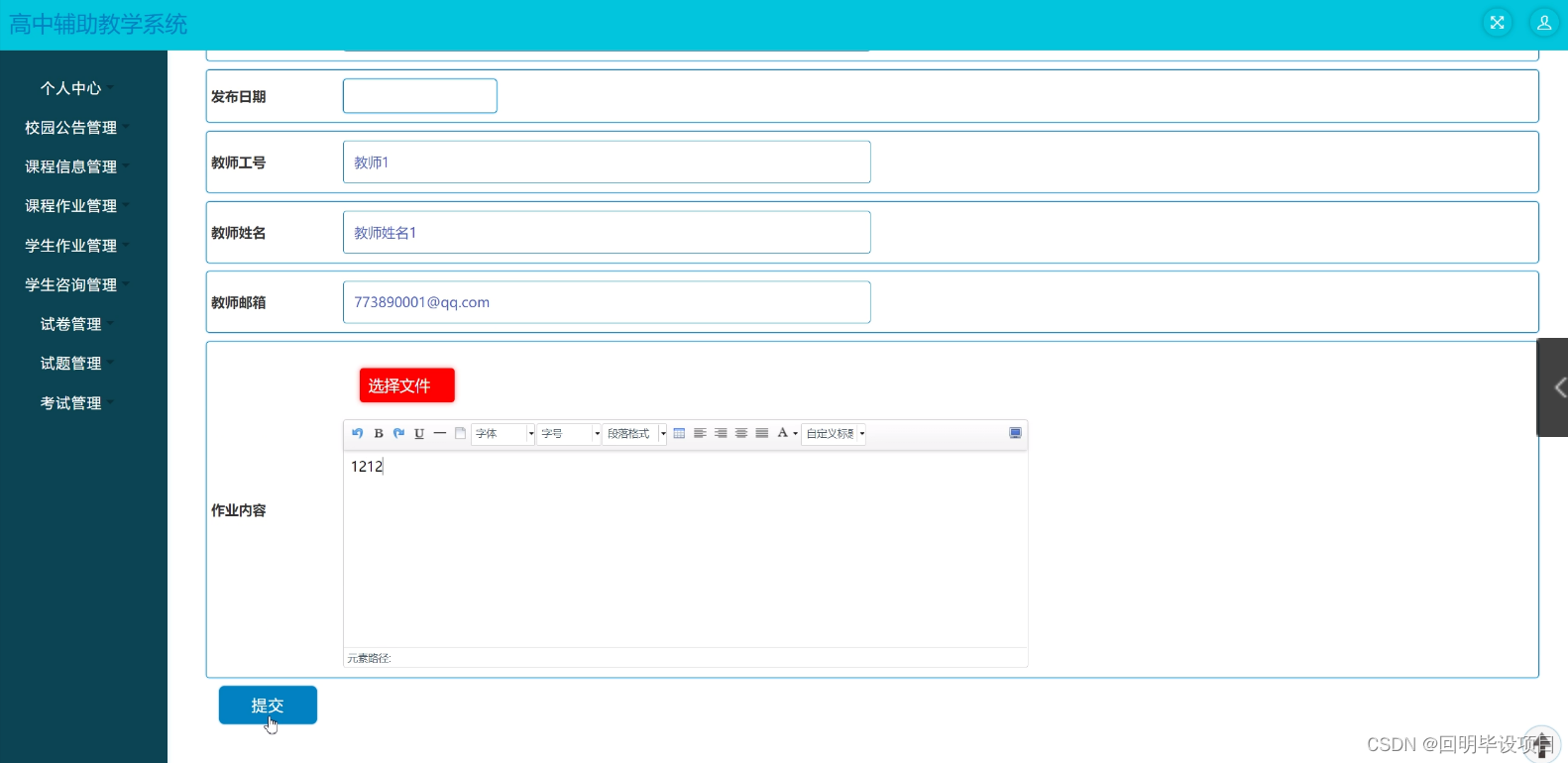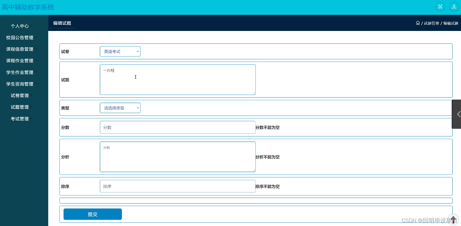 本文介绍了一个基于Java、MyBatis、Maven和MySQL的高中辅助教学系统,涵盖B/S架构、前端JSP+CSS+JS交互、后端业务逻辑处理以及数据库交互。项目旨在提高学生学习效率和教师教学管理。