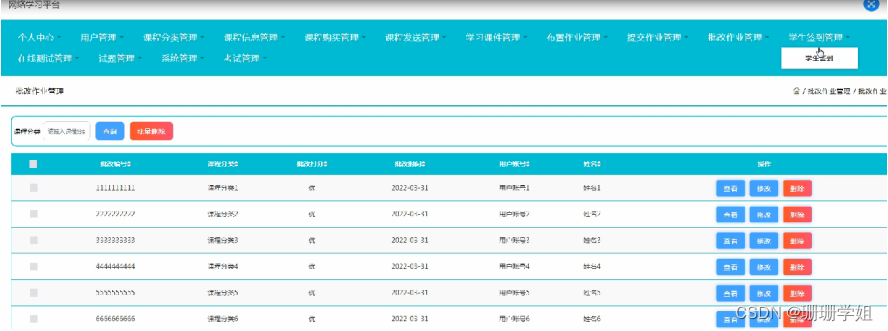 批改作业管理,在批改作业管理页面可以对批改编号,课程分类,批改打分,用户账号,姓名等内容进行查看,修改和删除操作;如图5-13所示。