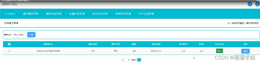 课程购买管理,在课程购买管理页面可以对购买编号,课程名称,课程分类,价格,购买时间,用户账号,时间,是否支付等内容进行查看操作,如图5-15所示。