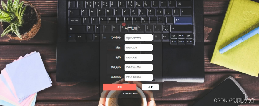 用户注册,在用户注册页面通过填写用户账号,姓名,密码,确认密码,电话号码等信息进行注册操作,如图5-2所示。