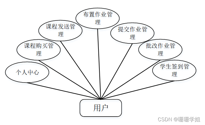 (b)用户;进入系统可以对个人中心,课程购买管理,课程发送管理,布置作业管理,提交作业管理,批改作业管理,学生签到管理等功能进行操作。用户用例图如图3-2所示。