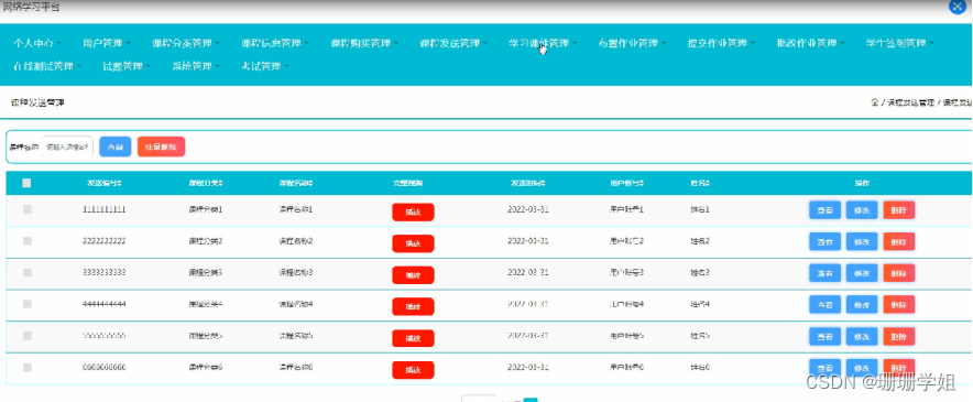 课程发送管理,在课程发送管理页面可以对发送编号,课程分类,课程名称,完整视频,发送时间,用户账号,姓名等内容进行查看,修改和删除操作;如图5-9所示。