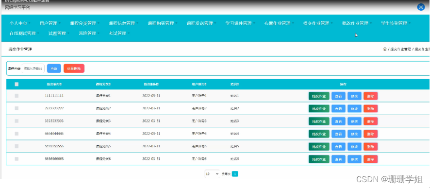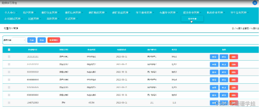 提交作业管理,在提交作业管理页面可以对提交编号,课程分类,提交时间,用户账号,姓名等内容进行批改作业,查看,修改和删除等操作;如图5-12所示。