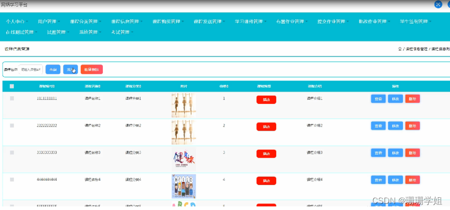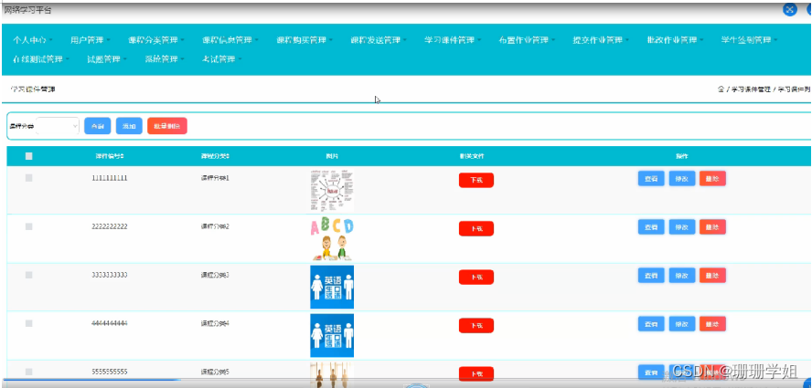 学习课件管理,在学习课件管理页面可以对课件编号,课程分类,图片,相关文件等内容进行查看,修改和删除等操作,如图5-10所示。