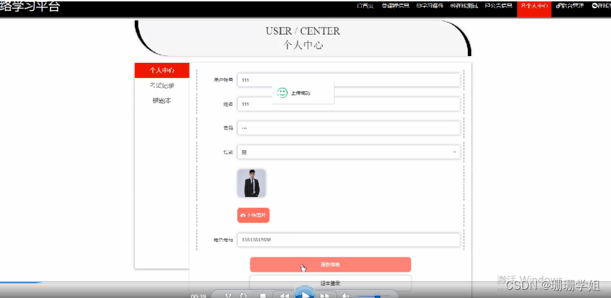 个人中心,在个人中心页面通过填写用户账号,用户姓名,密码,性别,图片,手机号码等内容进行更新信息,还可以根据需要对考试记录,错题本等进行相对应操作,如图5-4所示。