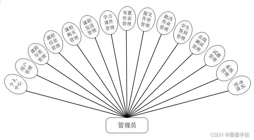 (a) 管理员;管理员使用本系统涉到的功能主要有:个人中心,用户管理,课程分类管理,课程信息管理,课程购买管理,课程发送管理,学习课件管理,布置作业管理,提交作业管理,批改作业管理,学生签到管理,在线测试管理,试题管理,系统管理,考试管理等功能。管理员用例图如图3-1所示。