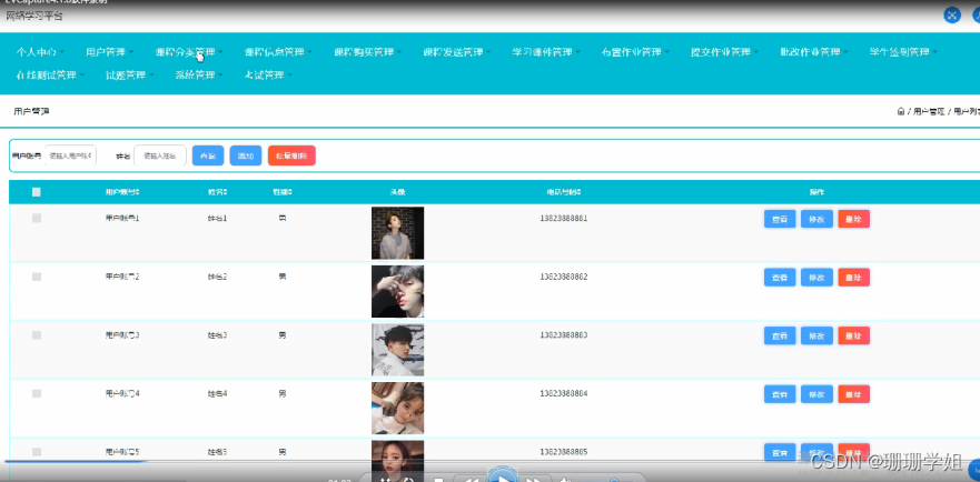 用户管理,在用户管理页面可以对用户账号,姓名,性别,头像,联系电话等内容进行查看,修改和删除等操作,如图5-7所示。