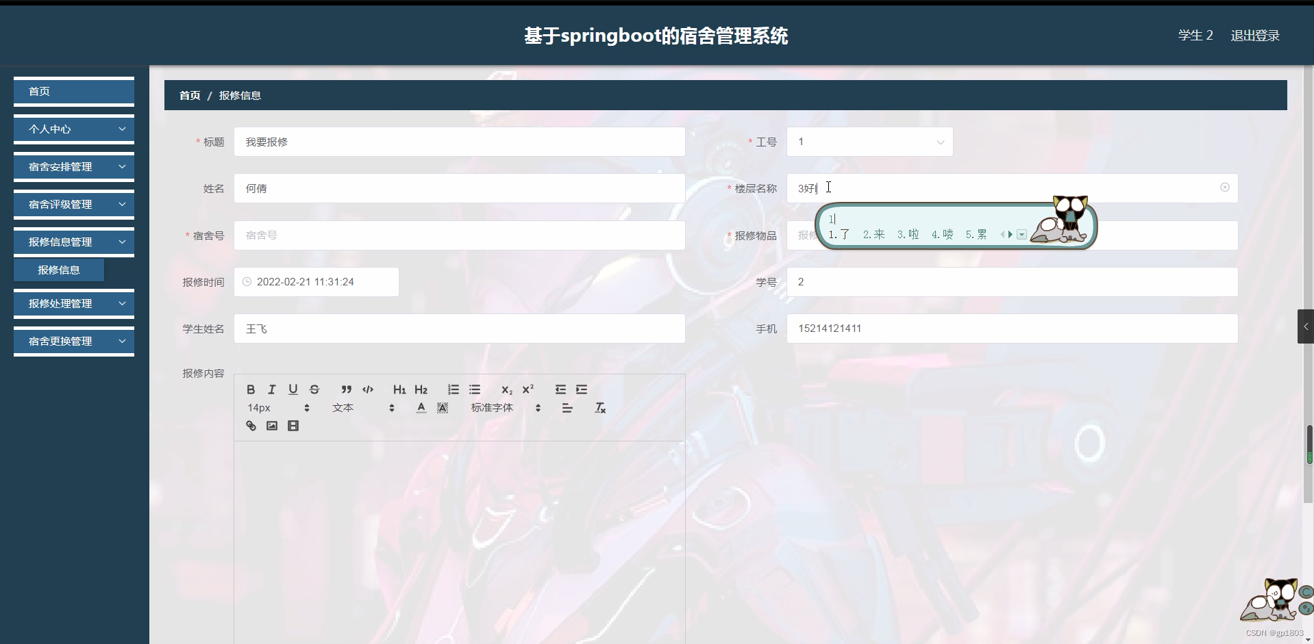 - 报修处理功能:宿舍管理员可以及时处理学生的报修请求,并跟踪维修进度。