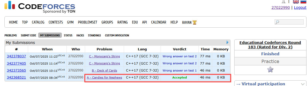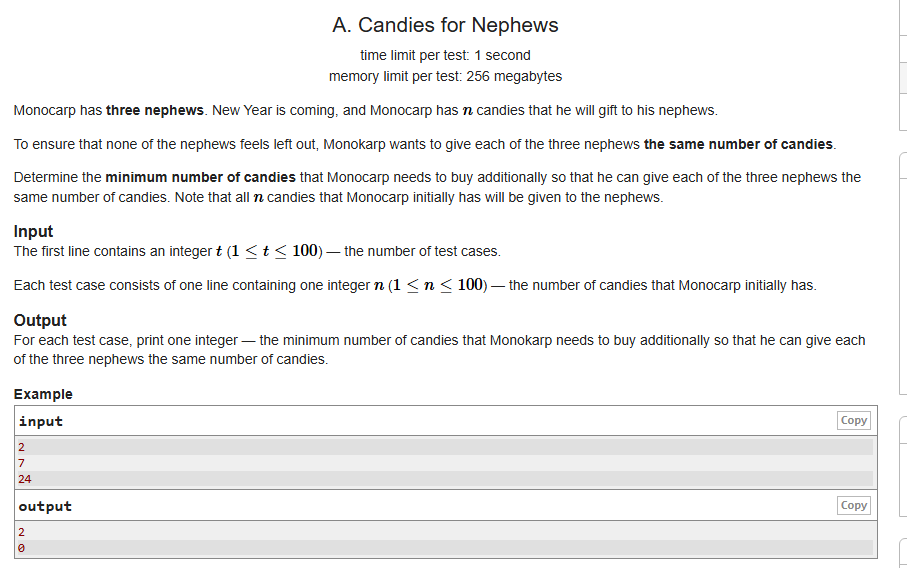 题意:Monocarp想给三个侄儿分糖果,手里有n个,请问还需要买几个?这样才能使得每个侄儿得到的糖果一样多。换做数学公式就是,糖果的总数量 可以整除3,或者说除以3没有余数。