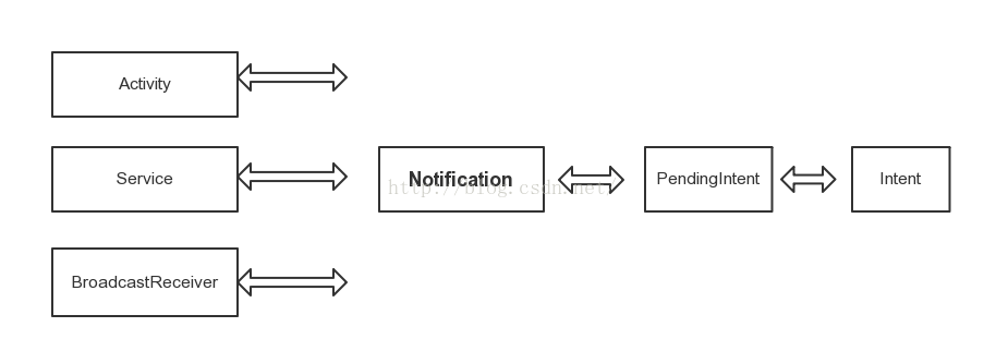 Notification的使用,必然离不开和Activity、BroadcastReceiver、Service组件间的配合,如: