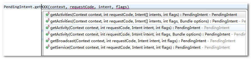 PendingIntent pendingIntent = PendingIntent.getXXX(context, requestCode, intent, flags)