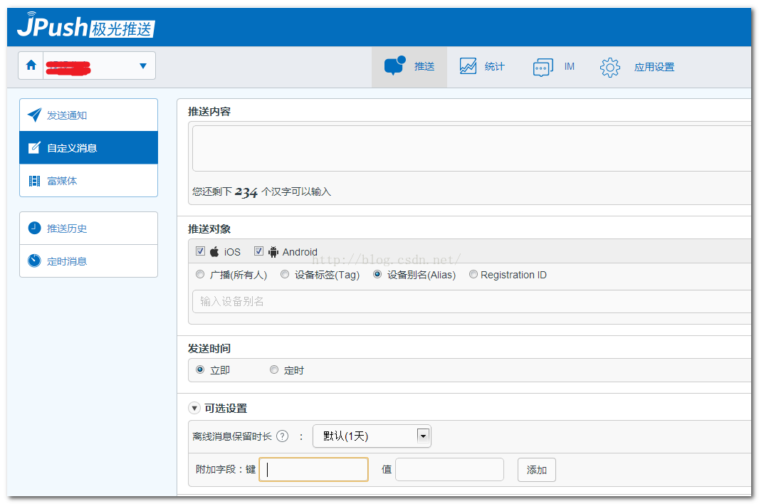 2. 可选设置中添加的附加字段,JPush平台会自动按照Json数据格式拼接,发送给客户端,按照指定官方Key值获取。