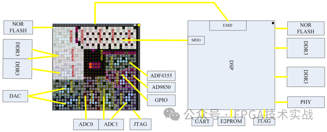 根据FPGA其他外设整体布局规划,DAC分配至FPGA Bank12和Bank13上,如下图所示。
