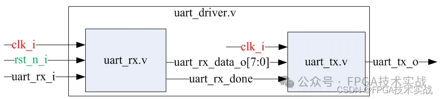 软件设计划分为接收模块uart_rx.v和uart_tx.v两个模块,顶层模块uart_driver.v互联两个模块,如下图所示。