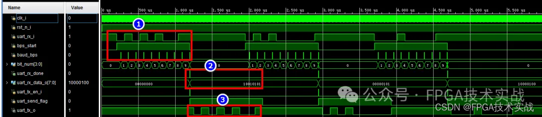 图中①处,仿真UART接收串口信号uart_rx_i输入数据8'b10101001,baud_bps在每个bit位宽中间时刻采样,bit_num计数接收到的数据bit个数,数据按照LSB端接收;