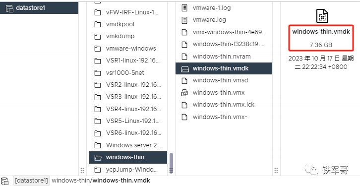 然后我们打开数据存储浏览器,看一下磁盘使用情况。首先是Windows-thin,实际磁盘文件大小为7.36 GB。