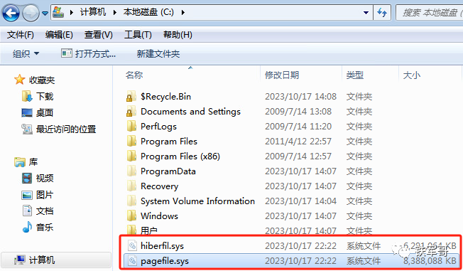 和实际显示占用的21.2 GB之间存在13.84 GB的差距,但如果我们在系统磁盘中查看隐藏文件就清楚了,有两个系统文件:hiberfil.sys和pagefile.sys,这两个文件都是Windows操作系统中的系统文件,合计占用了将近14 GB的磁盘空间。