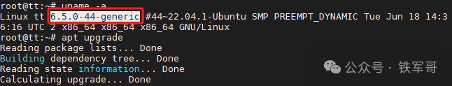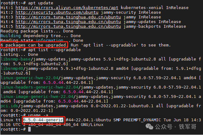 可以看到,升级之后,显示仍有6个软件包可以更新,跟过程中提示的6个不会更新的软件包情况一致;除此之外,内核版本还是6.5.0-44-generic,没有变化。