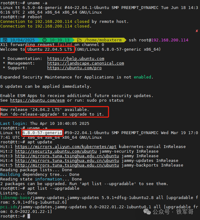 升级执行完成之后,可以看到内核版本并没有变化,此时需要重启系统来加载新的内核。重启之后,可以看到提示系统版本已经是Ubuntu 22.04.5 LTS,内核版本也已经升级到6.8.0-57-generic;同时,还提示有24.04.2 LTS可用,但需要使用do-release-upgrade来升级。