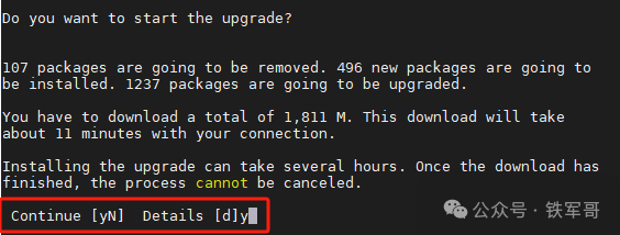 然后才进入正题,提示需要下载1811 MB文件,并且安装可能耗费几个小时,需要输入y开始升级。