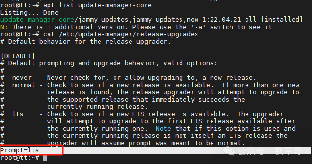检查升级策略文件/etc/update-manager/release-upgrades,确保升级策略为LTS。