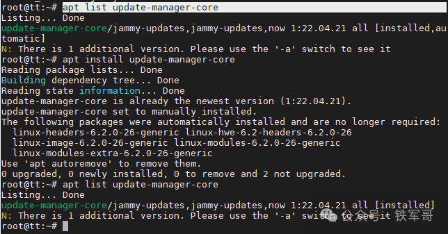做好心理准备之后,我们先确认升级核心工具update-manager-core已安装。