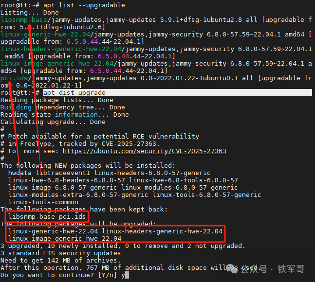 这也就说明apt dist-upgrade仅更新当前发行版(即22.04 LTS)内的软件包和内核,不会触发大版本升级(从22.04到24.04),且内核升级是独立于系统版本的。